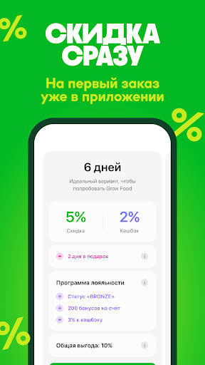 Grow Food - Питайтесь правильно с Готовой Полезной Едой Наше приложение предлагает идеальное решение для тех, кто стремится питаться правильно, не тратя время на готовку и планирование рациона. Grow Food осуществляет доставку готовой полезной еды на каждый день в Москве и Санкт-Петербурге, помогая клиентам заботиться о себе. Уникальные возможности Grow Food Приложение Grow Food создано для тех, кто хочет перейти на здоровое питание и придерживаться его без усилий. Можно выбрать из большого количества линеек питания под свои цели: похудение без голодания, набор массы, поддержание формы или просто чтобы не готовить. Наша главная особенность — кастомизация. Вы можете сами настроить меню, убрать нелюбимые продукты, заменить любое блюдо, добавить больше белка и т.д. Как это работает Вы выбираете меню, которое лучшим образом соответствует вашим целям — снижение веса без голодания, набор массы или просто здоровое питание без траты времени на готовку. Можно заменить блюда и исключить продукты, которые вам не нравятся, чтобы питание было не только полезным, но и подходящим вашему вкусу. Мы тщательно подсчитываем калории в соответствии с вашими запросами и готовим рационы питания на собственном заводе, обеспечивая их высокое качество и безопасность. Бесплатная доставка осуществляется в выбранный вами интервал — это удобно для тех, кто ценит свое время. Остается только разогреть готовую еду в микроволновке и наслаждаться вкусными и полезными блюдами. Преимущества Grow Food Выбор питания под разные цели: похудение без голодания, здоровое питание без траты времени на приготовление, поддержание веса и набор массы. Настройка меню: можно собрать только любимые блюда, исключить любые ингредиенты или добавить что-то свое в один клик. Выбор удобного времени для бесплатной доставки готовой еды. Возможность зарабатывать бонусы и получать кешбэк, чтобы правильно питаться было еще и выгодно. Оперативная и заботливая служба поддержки. Grow Food делает акцент на здоровое питание без голодания, предлагая готовую полезную и вкусную еду. Вы сможете достигнуть своих целей без стресса, дискомфорта и ограничений. Присоединяйтесь к Grow Food! Если вы хотите начать путь к здоровью, хорошему самочувствию и заботливому отношению к себе, скачайте приложение Grow Food и начните питаться готовой полезной едой! Мы всегда работаем над улучшением нашего сервиса и готовы принять ваши предложения и замечания. Напишите нам на bug@growfood.pro и приложите скриншоты, а мы все проверим и ответим вам. Grow Food — ваш надежный партнер в мире здорового питания, где каждой блюдо разработано с заботой о вашем благополучии. Установите приложение и убедитесь, что здоровое питание может быть вкусным и удобным! ️